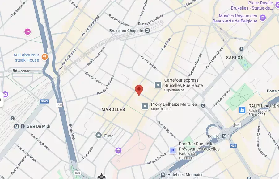 Le stationnement peut être un peu compliqué dans le centre-ville, mais le parking de la place Poelaert, ouvert 24h/24, se trouve à environ 5 minutes à pied du Café Modelé.